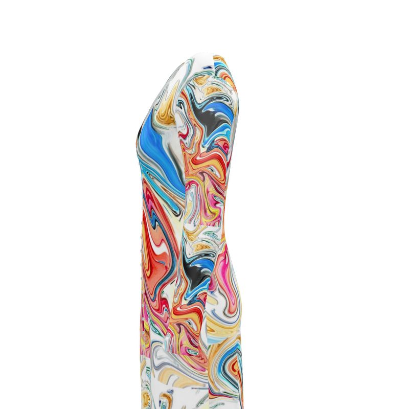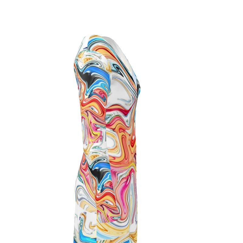 This cardigan / button dress is the perfect statement piece for any event. Combining a stunningly bold and colorful fluid art design, a v-neck, and long sleeves, you can easily transition any look from day to night. Delivering the perfect blend of style and comfort, this eye-catching piece is sure to turn heads.
